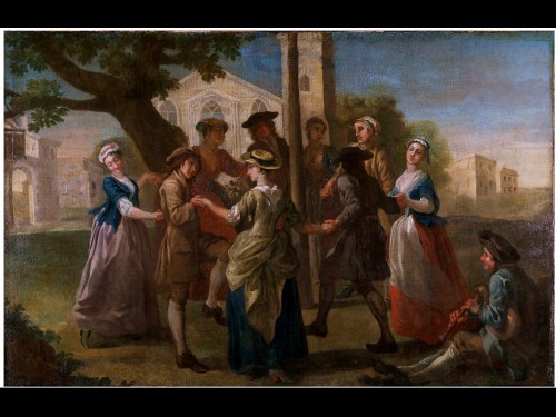 Las escenas de cortejo son recurrentes en la pintura del Rococó. En esta imagen podemos apreciar los colores pasteles muy usados durante esta epoca.