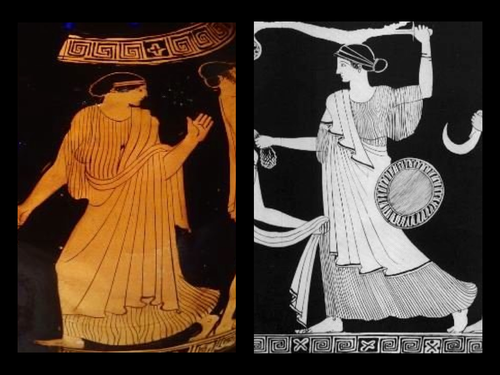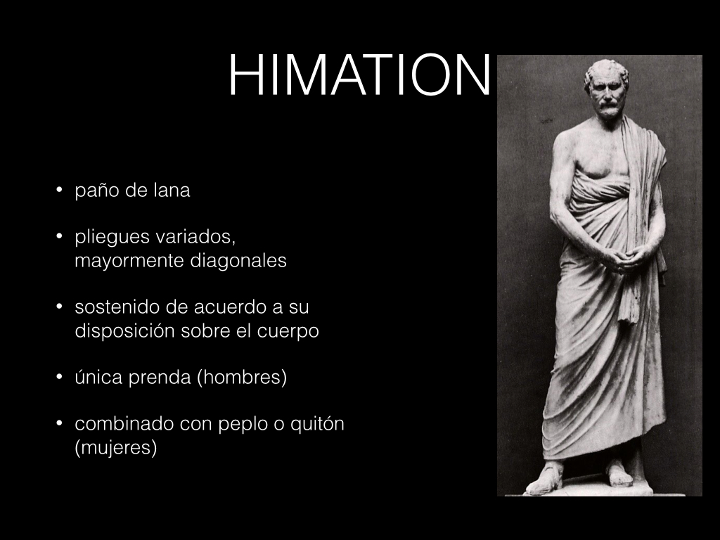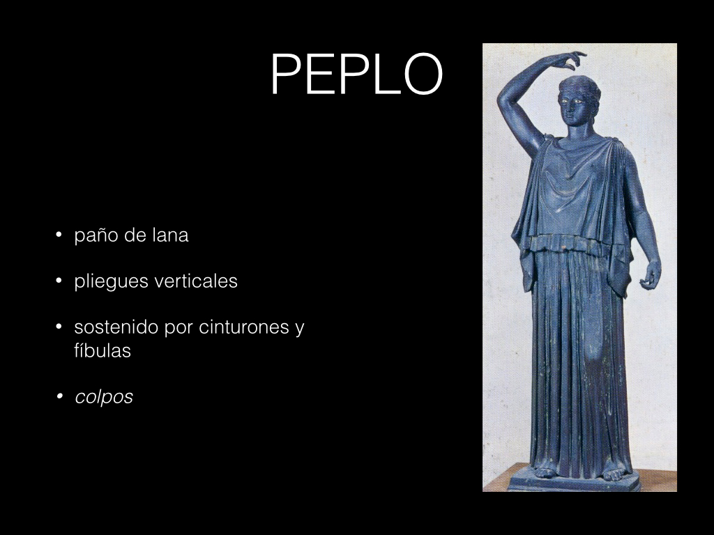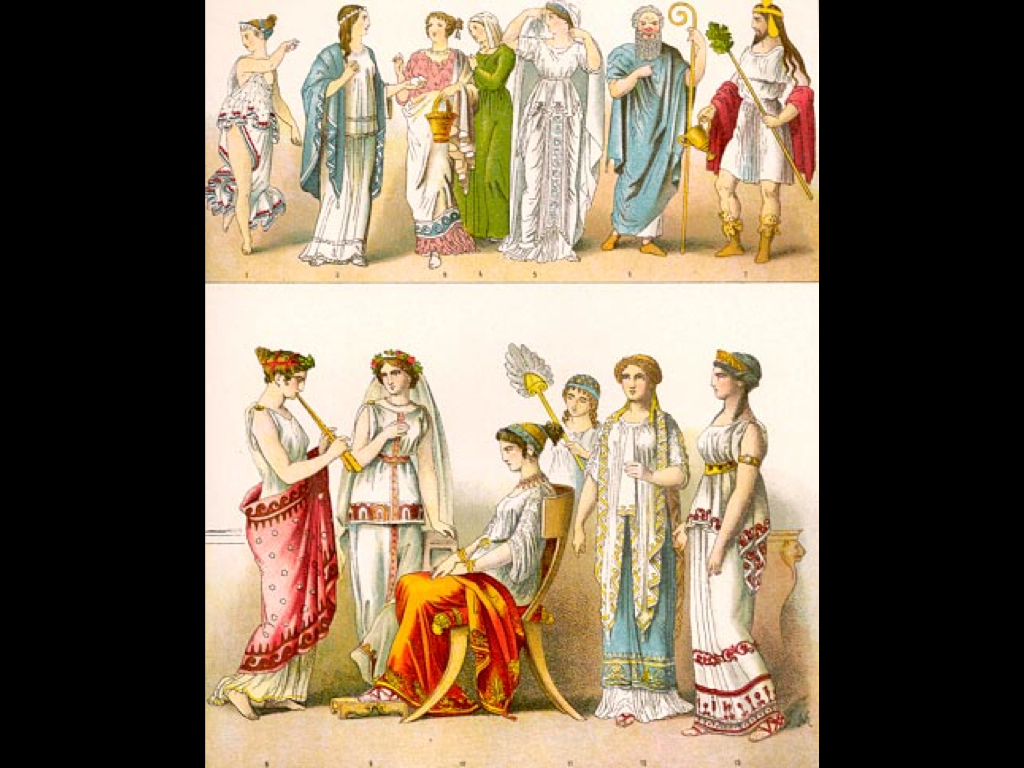 A diferencia de la creencia general, las prendas griegas no eran de color blanco o crudo liso, sino que estaban decoradas con bordados de colores formando guardas en los bordes de los paños. Las esculturas perdieron su color con el paso del tiempo, la información nos llega por medio de textos y es representada en ilustraciones como la que sigue