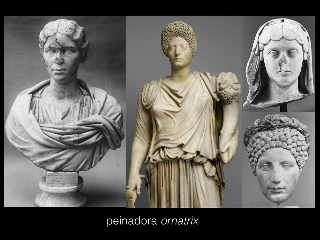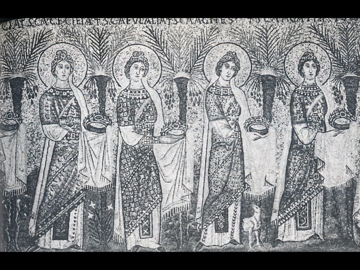 En la imagen siguiente,sobre el hombro derecho, se puede identificar la superposición de túnica y stola. La palla cubre el hombro izquierdo, se apoya sobre el tocado cruzando por la espalda y vuelve hacia el frente sobre de las piernas.