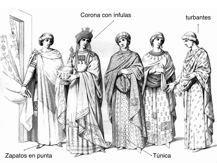 El triunfo del Cristianismo tiene gran influencia en el traje, el cuerpo se cubre por completo, se esconde. El emperador es un rey-sacerdote, representante de Dios en la tierra y su vida está regida por obligaciones religiosas. Su vestimenta, al igual que la de sus cortesanos y sirvientes, tiene características específicas de acuerdo a criterios de rango y función, el traje se vuelve fuertemente jerárquico.
