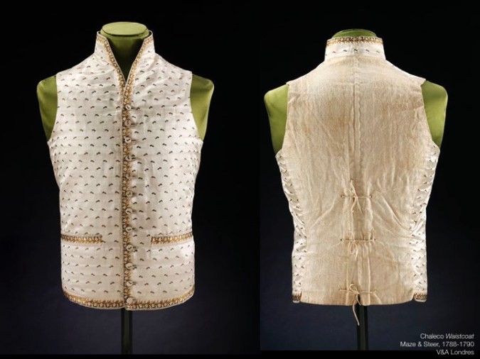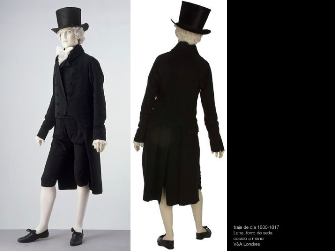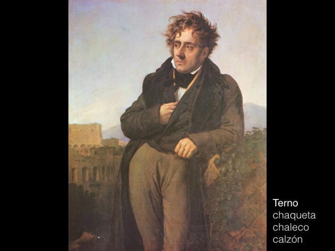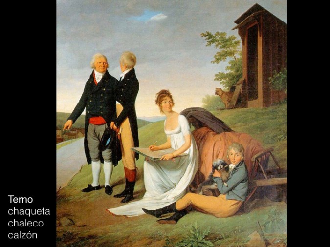 El traje masculino o terno está integrado por tres prendas, chaqueta, chaleco y calzón. La influencia inglesa será muy notable. El calzón se irá alargando lentamente, pasando de la rodilla a la pantorrilla, hasta alcanzar finalmente el tobillo a fines del periodo. Muy ajustados, algunos incluso realizados en tejido de punto, generalmente de colores claros, en contraste con las chaquetas.