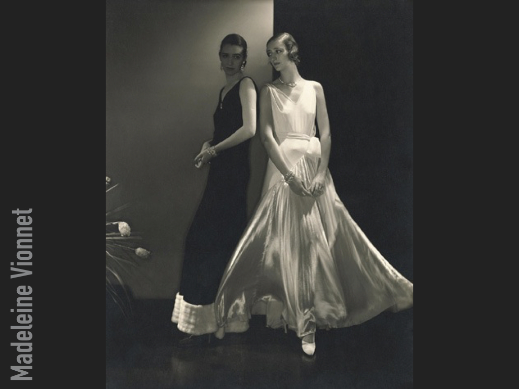 Una de las diseñadoras más destacadas del período es Madeleine Vionnet, responsable de la nueva técnica de corte al bies. Vionnet contruye sus trajes directamente sobre el cuerpo o el maniquí, logrando que las prendas se adapten a la silueta y no al revés. Valiéndose de pliegues y drapeados, sus trajes recuerdan al peplo, kitón e himation de la Grecia Clásica.