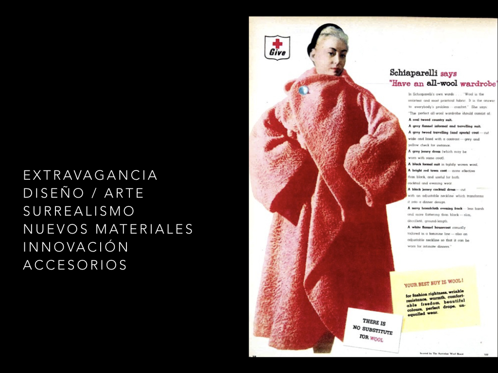 Schiaparelli trabaja con artistas como Man Ray, Jean Cocteau y Salvador Dalí. Sus prendas son extravagantes y revolucionarias. Es una de las pioneras en resignificar materiales en tiempos de escasez, usa celofán para sus bordados y hasta aspirinas a modo de botones. Lo mismo hará con los estampados, tomando motivos ordinarios de la vida cotidiana como textos de diarios o fósforos.