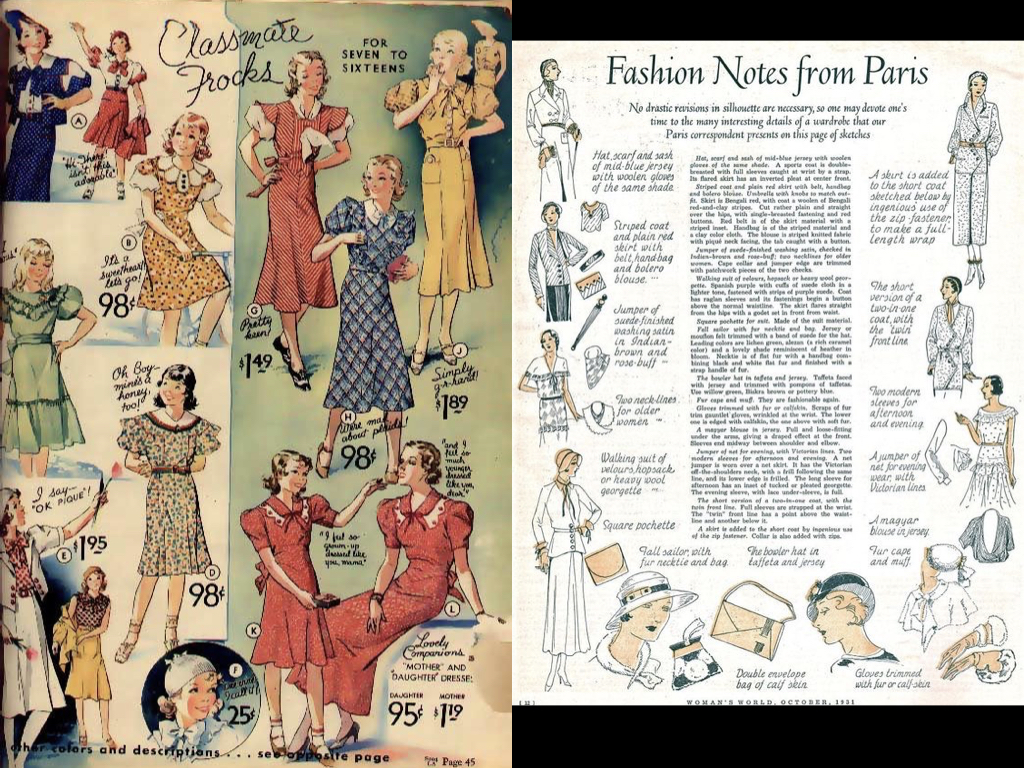 Debido a la crisis económica se reduce muchísimo el uso de los bordados, dando protagonismo a las telas estampadas con motivos pequeños y sin «pie» que facilitan la yuxtaposición en cortes complejos y no tienen demasiado desperdicio.