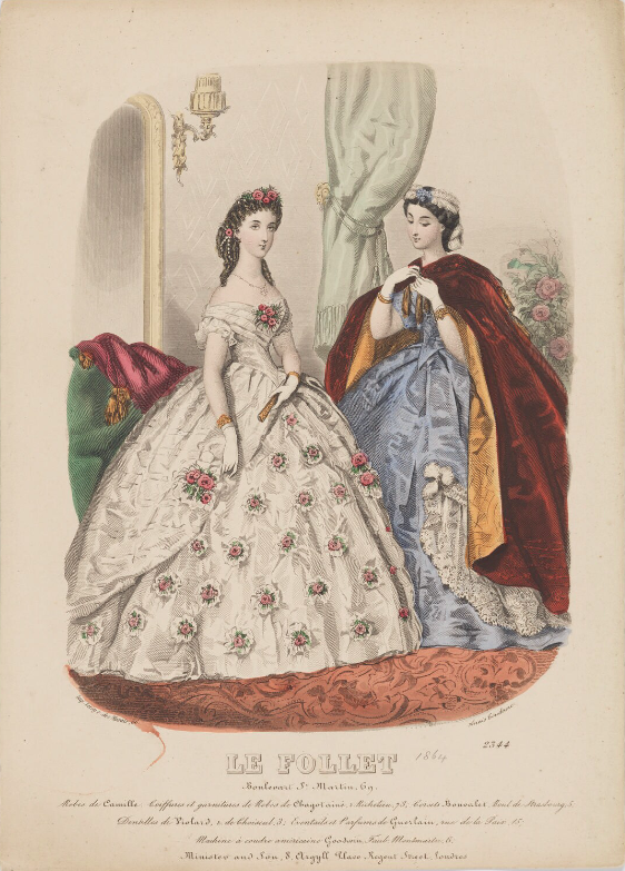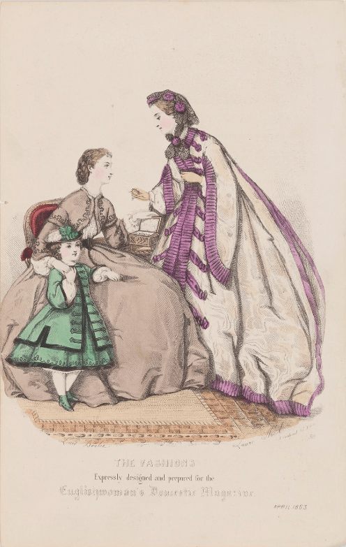 Las artistas mejor documentadas y más prolíficas de mediados del siglo XIX fueron las hermanas Colin, Heloise Leloir, Anais Toudouze y Laure Noel, quienes hábilmente transmitieron los detalles de vestimenta necesarios en escenas tradicionales y evocadoras. Las ilustraciones de moda estadounidenses, a veces modificadas de originales franceses, como en Godey’s Ladies’ Book y las publicaciones de Mme Demorest, podían ser aún más cotidianas, incluyendo en la escena objetos domésticos.