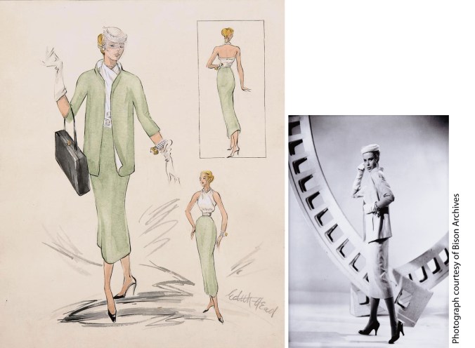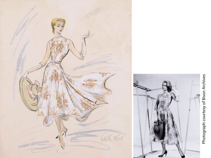 En las ilustraciones de Edith Head vemos algunos de los conjuntos diseñados para Grace Kelly, entre los que se encuentra un vestido camisero que se adapta al glamuroso estilo New Look característico de la época. También vemos el vestido camisero en el personaje de la enfermera aunque en este caso se trata de un modelo muy simple y con hombros rígidos que nos recuerda un poco al estilo utilitario de los años 40.