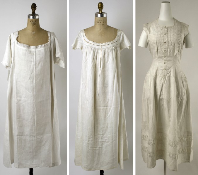 El vestido chemise de muselina de algodón blanco que llevan las mujeres retratadas en la imagen superior, fue el protagonista del guardarropas femenino durante los primeros años del Siglo XIX.