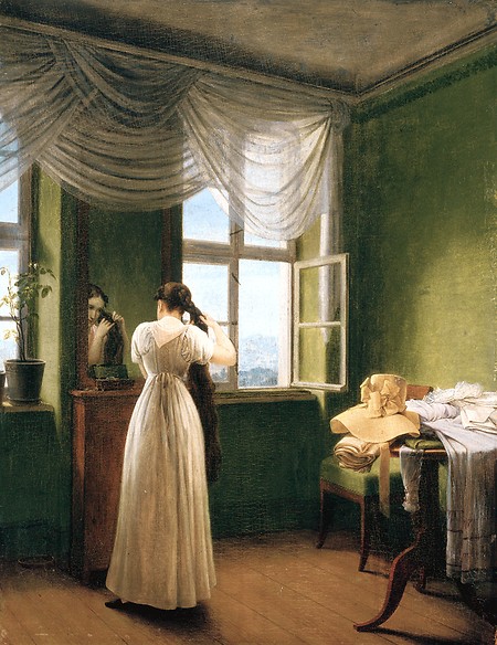 Con el transcurso de los años, y ante las crecientes muertes por tuberculosis debidas a la poca protección corporal del chemise de muselina, los vestidos fueron retomando el uso de textiles más pesados y cubritivos. Podemos ver este cambio en la mujer de verde, si bien mantiene las características principales de la silueta del primer cuarto del Siglo XIX: talle alto marcado debajo del busto y falda larga con pliegues y de caída natural sin ahuecador.