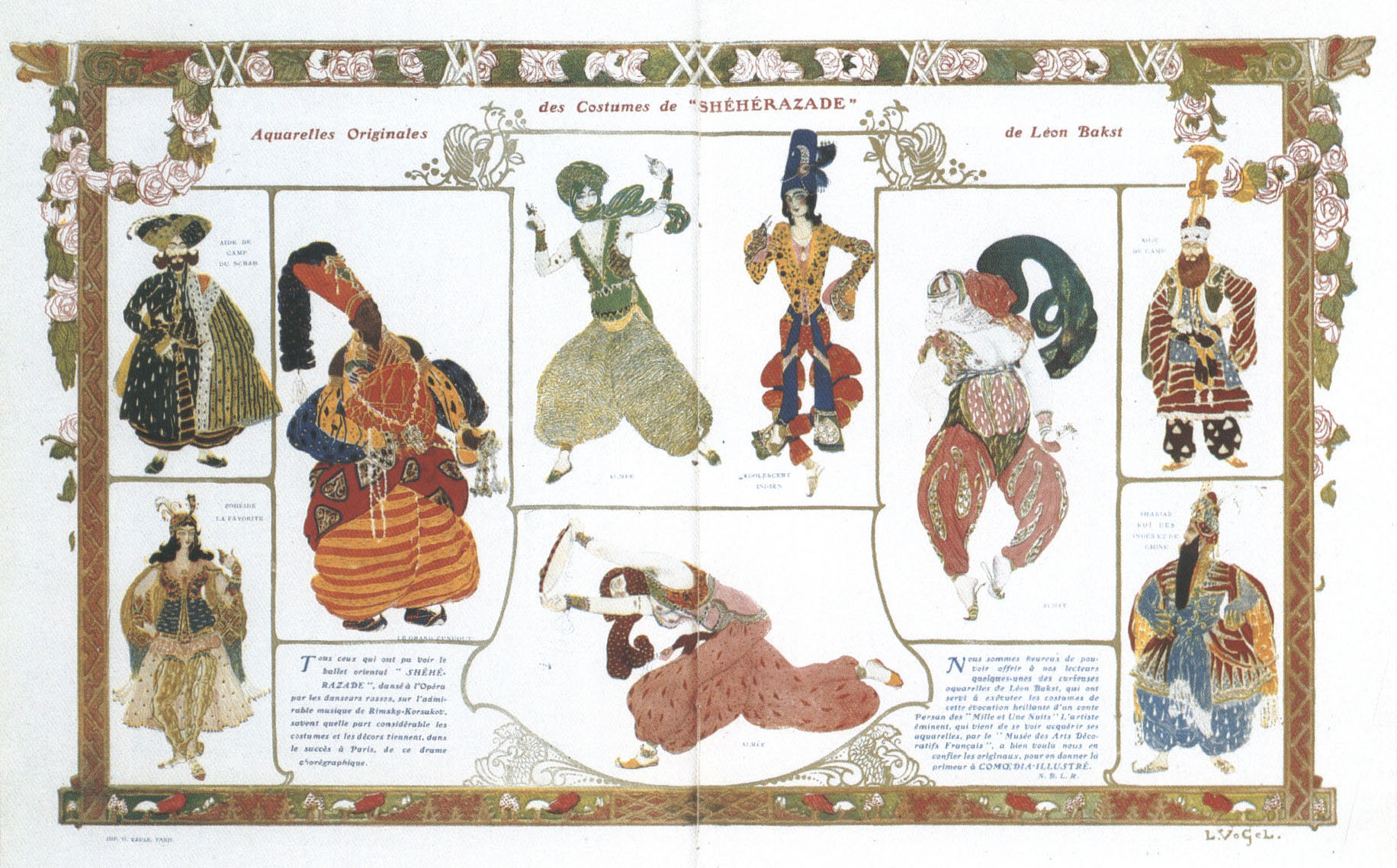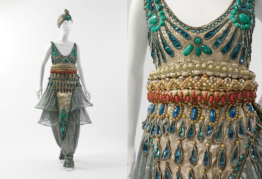 Este conjunto fue realizado para la fiesta «Las mil y dos noches» organizada por Paul Poiret en 1911 para promover sus nuevas creaciones en todo el esplendor y glamour de la tendencia orientalista.
