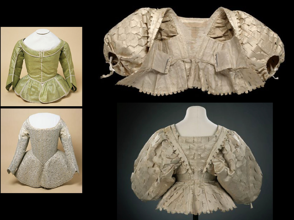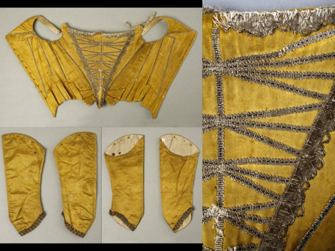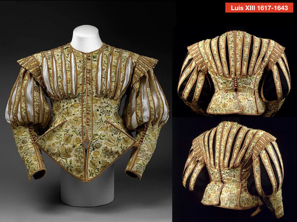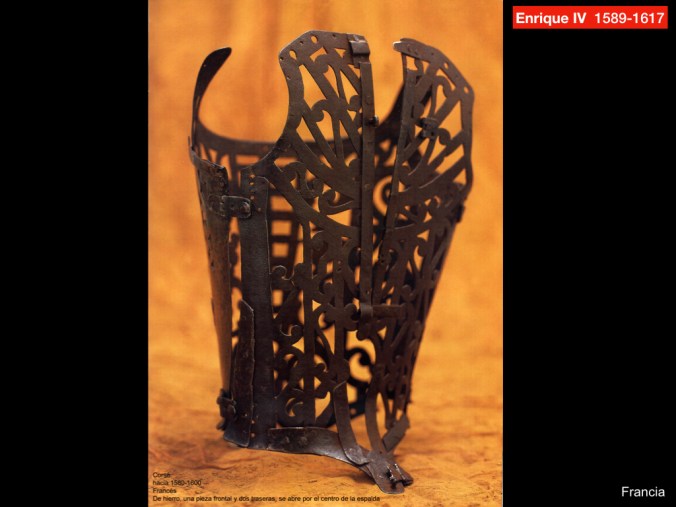 La imagen que sigue muestra un corset francés de fines de siglo XVI, consiste de tres piezas rígidas de hierro articuladas con bisagras laterales. Se forraba con textiles pesados y resistentes y se llevaba sobre una camisa que era la primera piel.