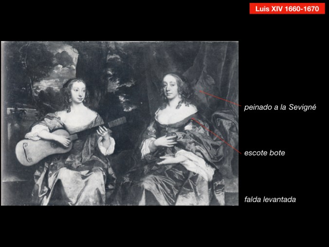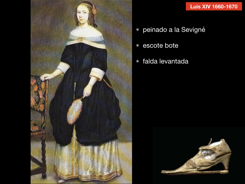 Los cambios en el traje femenino son menores comparados con el caso masculino. Se impone un nuevo escote con forma de bote y el peinado de moda con rizos y recogido a los lados se denomina a la sevigné