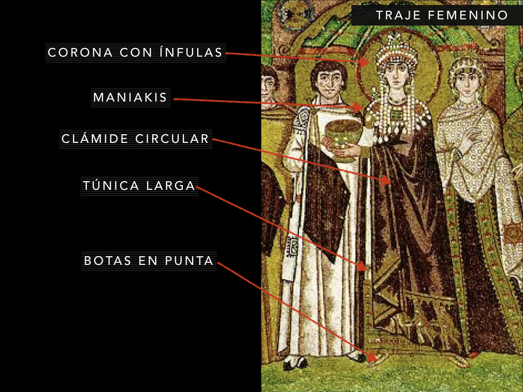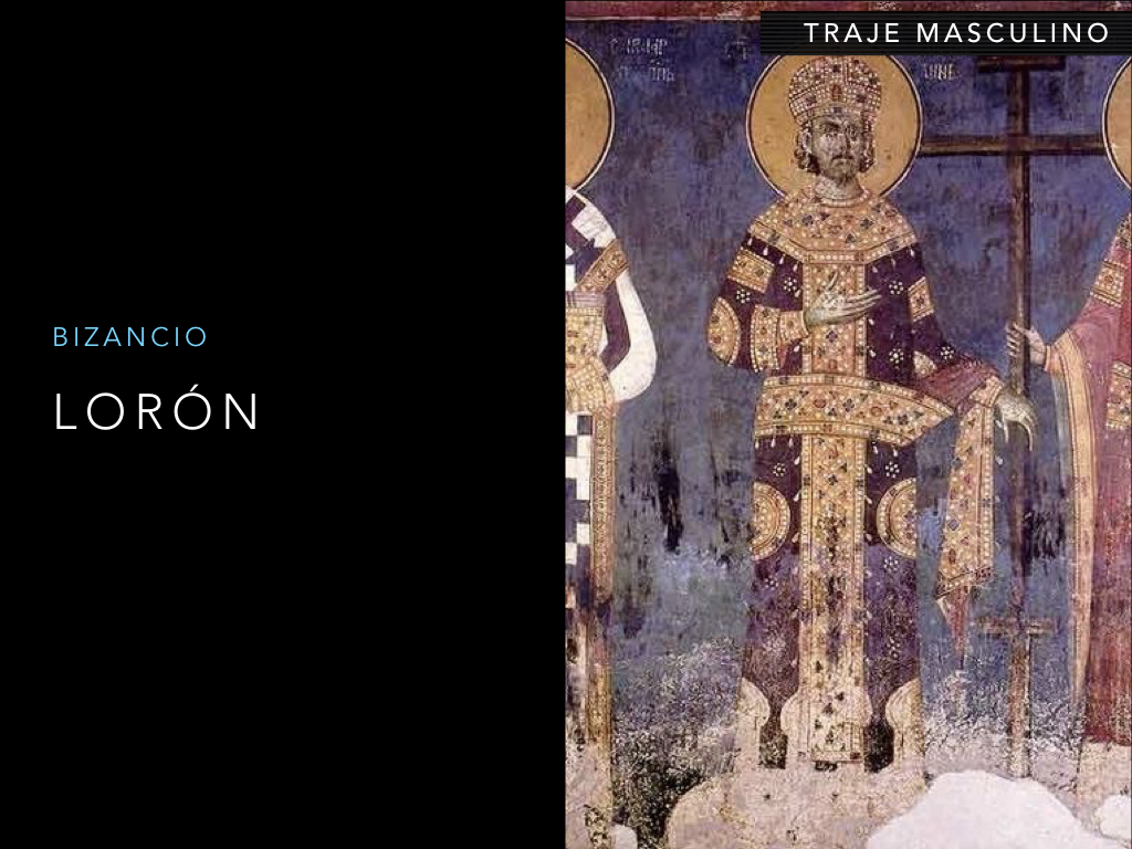El traje Bizantino surge de la fusión del traje drapeadogrecolatino y la tradición textiloriental Los materiales seránsuntuosos, muy decorados y coloridos.
