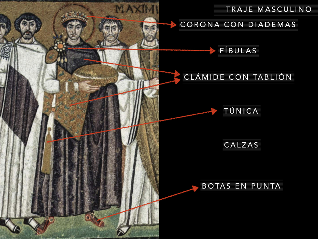 El traje Bizantino surge de la fusión del traje drapeadogrecolatino y la tradición textiloriental Los materiales seránsuntuosos, muy decorados y coloridos.